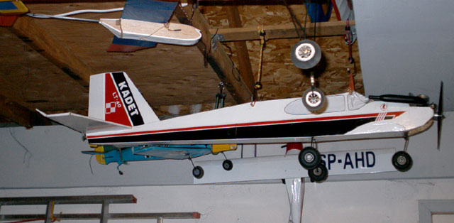 Sig Kadet LT-40 is a high wing trainer.   She had standard four channels (ailerons, elevator, ruder and throttle). At 70 inches wingspan the plane came out at 5.5 lb.  Four standard Hitec servos (HS-422) for ailerons, elevator, throttle and ruder. Glow engine calss 40 powered MA 10x6 prop.  During years I changed the powerplant starting with OS-LA40, later COMO-40, and finally Magnum XL-40.