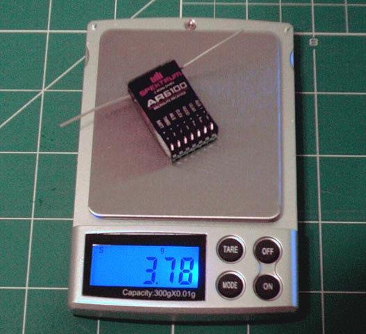 Finally there is a weight comparison between Spektrum AR6100 and DSM2 compatible receivers from Hobby City.1. Spektrum AR6100 weights 3.78g. Spektrum specifies the weight less than 3.5g, which is lower than the true weight by 0.28g.