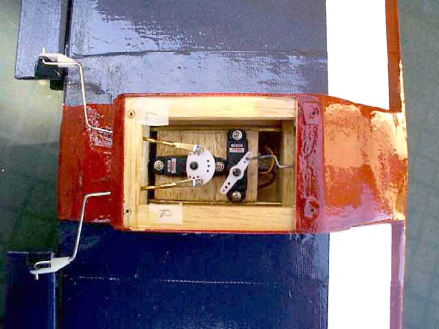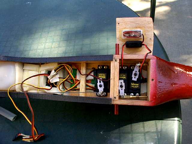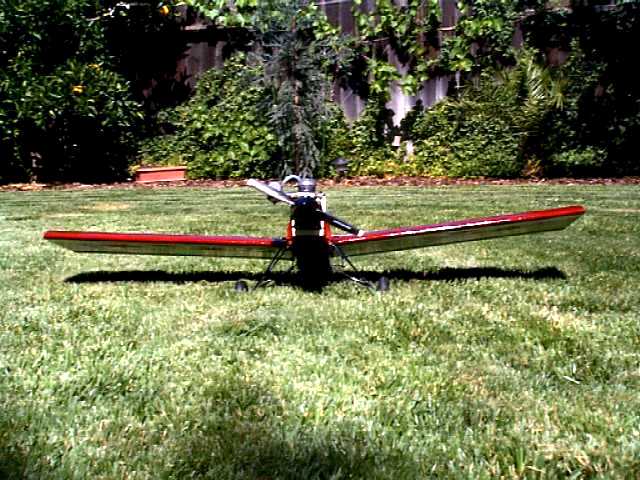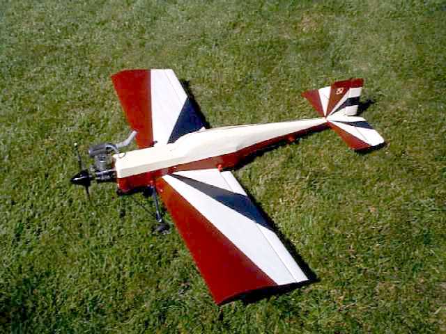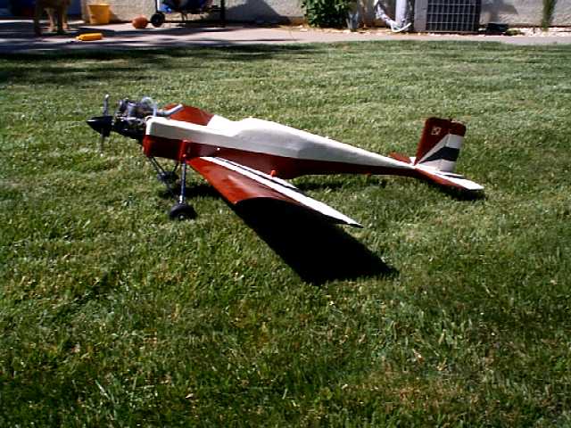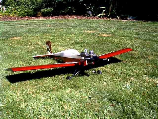 Big Bird was designed as a low wing trainer. She had standard four channels (ailerons, elevator, ruder and throttle) plus additional channel for mechanical flaperon mixer. At 48 inches wingspan the plane came out at 4.5 lb. Three standard Hitec servos (HS-422) for elevator, throttle and ruder, and two mini servos (HS-81) for ailerons and flaperon mixer. Glow engine COMO-40 powered MA 10x6 prop.