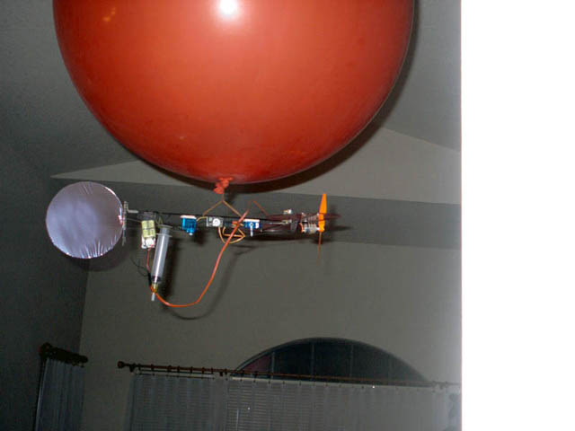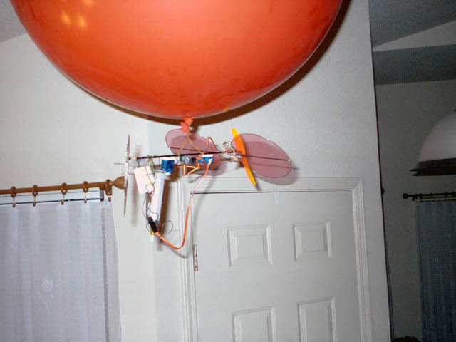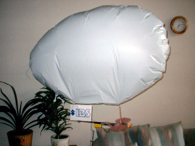 The adventure started when my son broke his wrist while skiing in Tahoe area. Having his right hand in a cast made him very uncomfortable piloting model planes. To ease that discomfort I decided to build him a model, which would be very easy to fly indoor. All model airplanes were to heavy at that time to be capable of flying at crawling slow speed and being able to turn in tight corners at the same time. However if model can be attached to lighter than air balloon it's weight would be reduced and what seemed to be impossible, became doable.